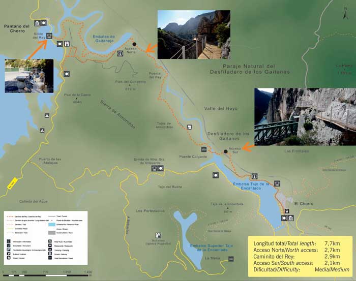 El recorrido completo del Caminito del Rey es de 7,7 kilómetros, pero no todo son pasarelas. En realidad, 4,8 kilómetros son accesos y el resto (unos 2,9 kilómetros) es el trayecto más conocido y espectacular e incluye el Valle del Hoyo. El tiempo estimado de recorrido es de 4 o 5 horas, según la Diputación de Málaga, dependiendo de si se accede por Ardales (recorrido descendente) o por Álora (ascendente). Sí es importante saber que el camino no es circular, es decir, que al llegar al final hay que regresar. Está previsto que se habiliten autobuses lanzadera, pero no hay nada concretado a fecha de marzo de 2015.