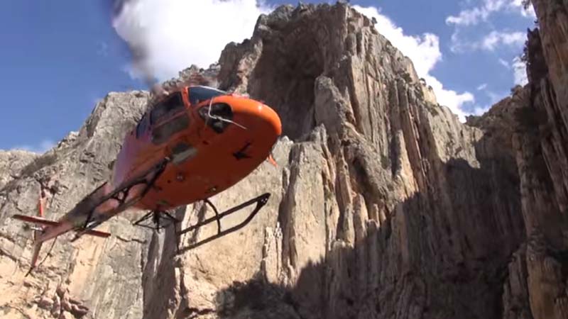 Trabajadores en suspensión y un helicóptero para llevar los materiales