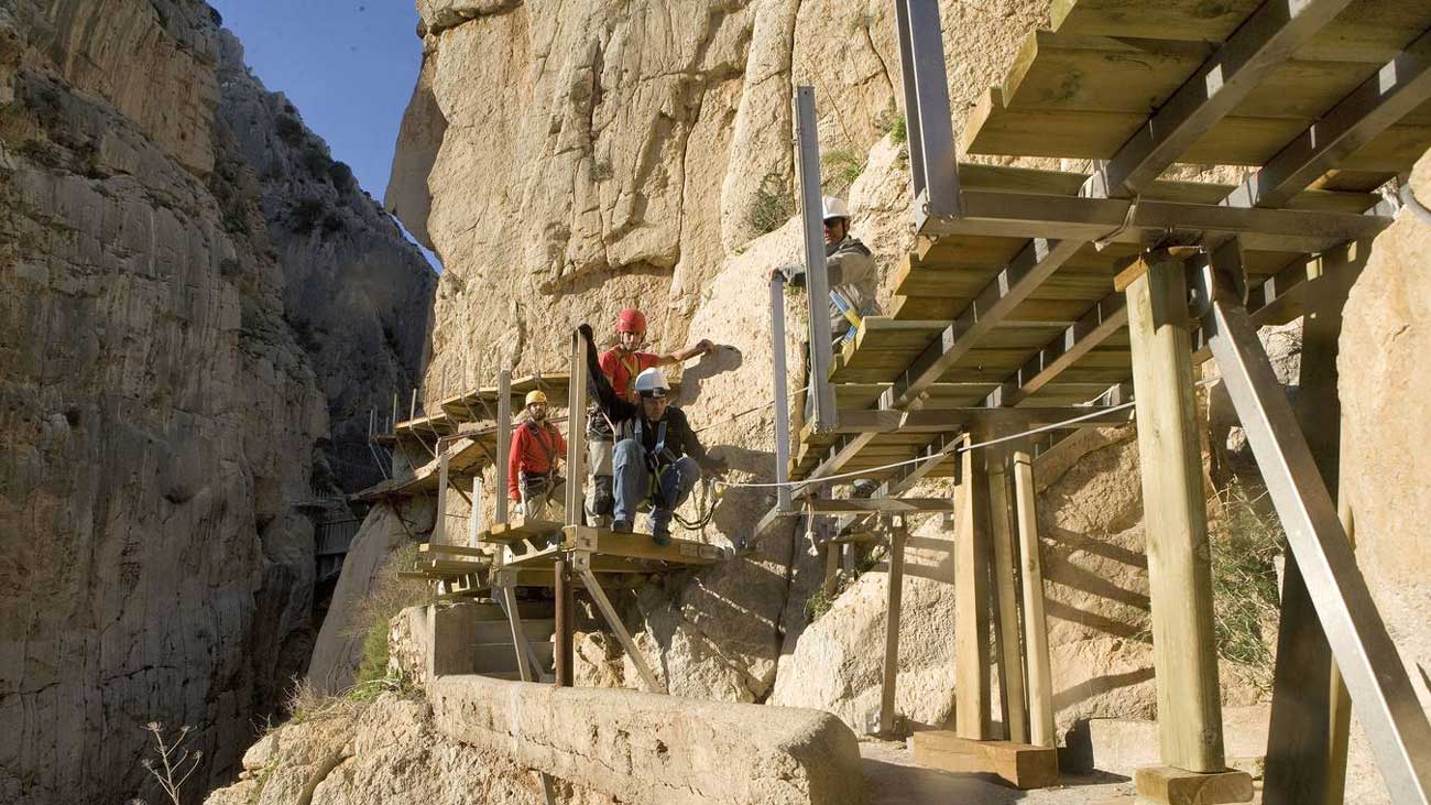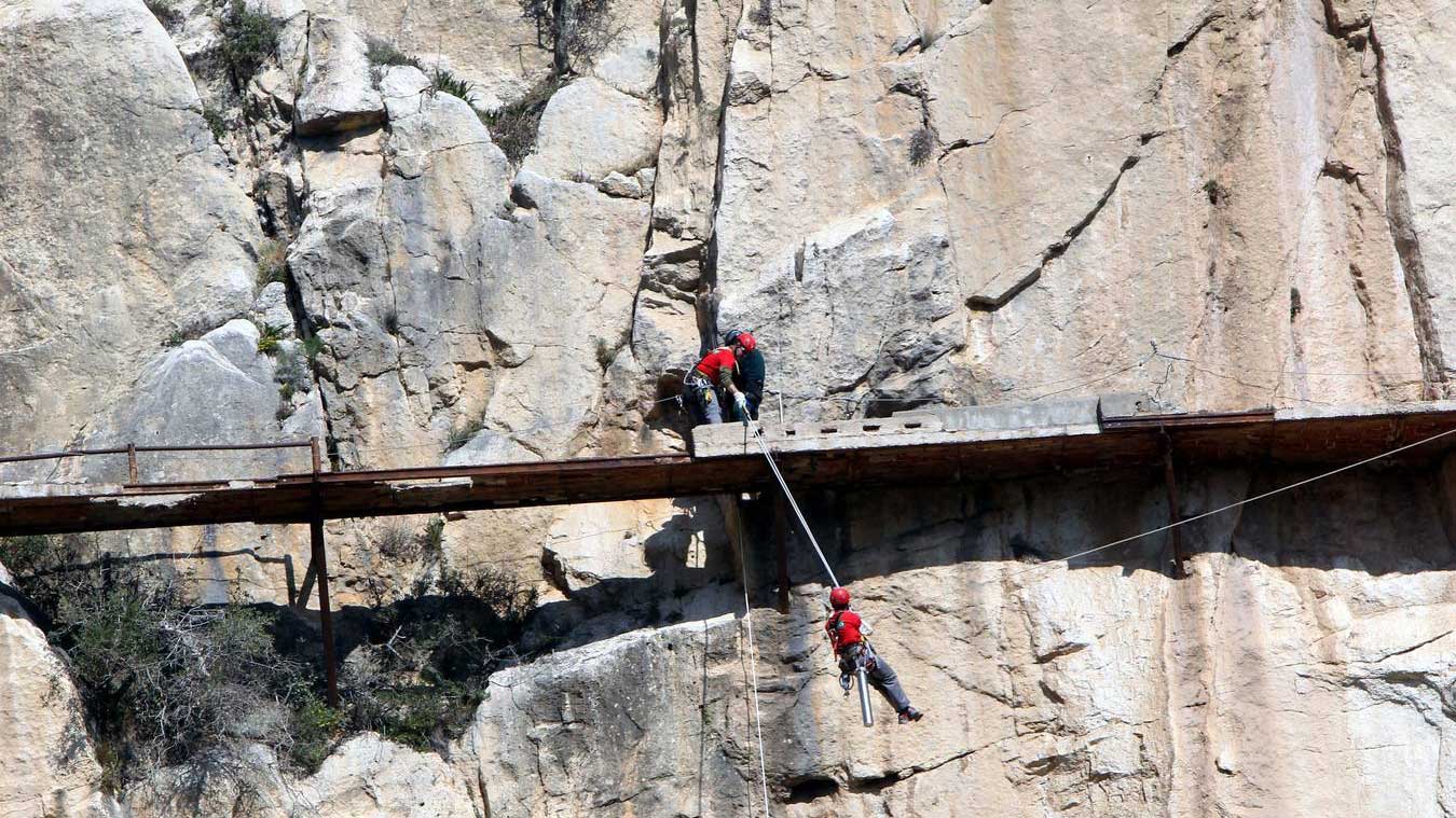 Las dificultades del entorno obligaban a definir cómo se iba a trabajar y a abordar la construcción. Si hace 114 años fueron marinos colgados del desfiladero los que montaron un sendero de madera primitivo (luego vendría el de cemento en los años 20), en los tiempos actuales la solución tenía que ser otra. O no. De hecho, se decidió contar con los servicios de empresas especializadas en trabajos verticales. Buena parte de la construcción implicaba que los trabajadores -alpinistas y espeleólogos- también se colgaran para construir los 1,2 kilómetros de la pasarela suspendida sobre el trazado de la antigua, que se ha preservado en los tramos que no han desaparecido. Su labor ha consistido en colocar los paneles de madera con anclajes metálicos y adaptarlos a la morfología de la roca.